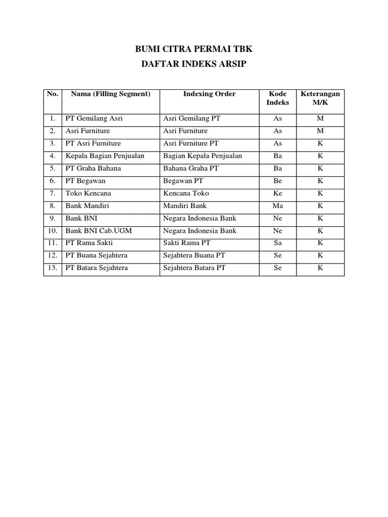 Cara Mengindeks Nama Perusahaan - Peraturan Mengindeks Memberi Kode Arsip Novitaanggarisafitriblog : cara mengindeks nama perusahaan mengindeks nama perusahaan pada umumnya diutamakan nama yang dipentingkan kemudian diikuti dengan badan hukum atau kegiatannya, misalkan:. Jika surat masuk, maka yang diindeks adalah nama pengirim surat.jika surat keluar maka yang diindeks adalah nama tujuan. Peraturan mengindeks nama orang indonesia. Mencari limbah alumunium di daftar perusahaan Sistem ini biasanya digunakan untuk mengatur arsip atau dokumen pegawai yang bersifat individual. Berikut ini cara mengindeks nama perusahaan atau lembaga.