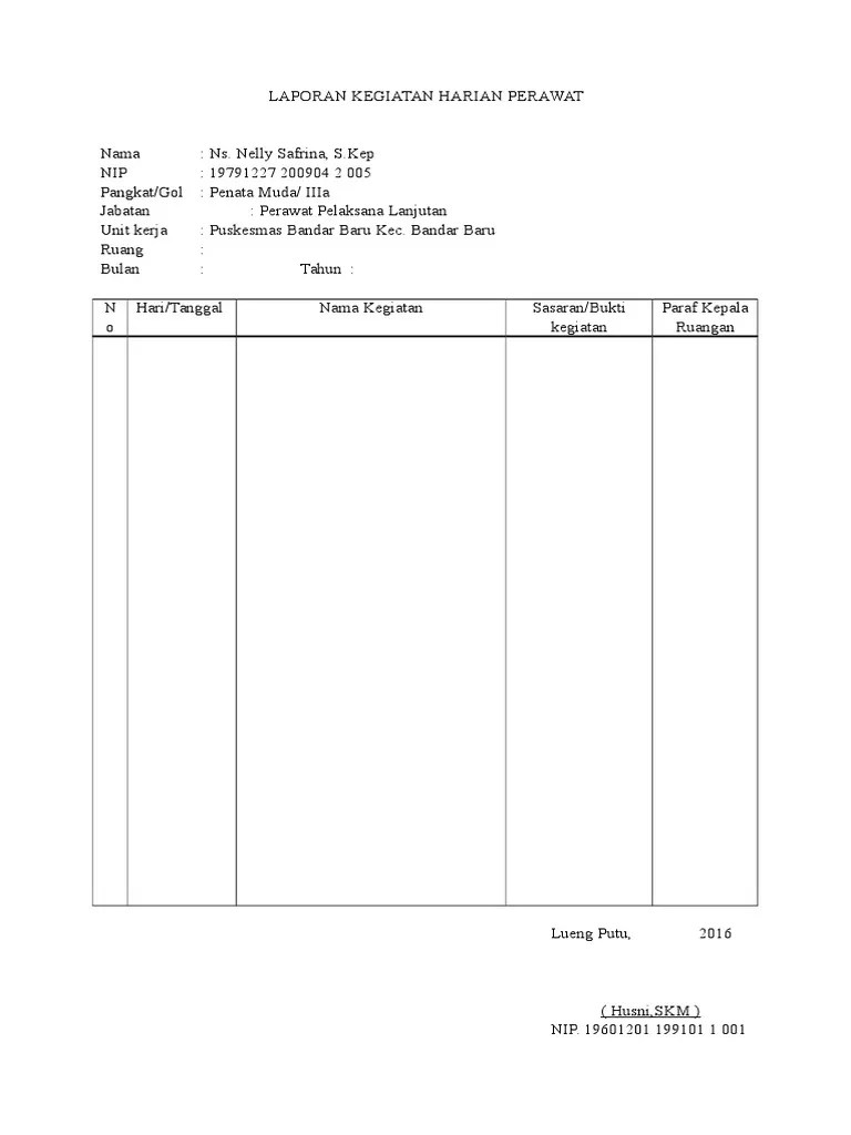 Melakukan pengkajian keperawatan dasar pada individu;, melakukan pengumpulan data pada klien dengan tingkat ketergantungan minimal tanpa risiko, melalui . Format log book harian perawat. Uraian tugas perawat terampil, meliputi:. 3 nomor butir lihat file . Panduan dan log book program profesi ners keperawatan gawat darurat. Kartu pencatatan asuhan keperawatan gigi dan mulut . Sebagai contoh pada perawat terampil pada butir pengkajian individu . 1 makalah kasus log book gigi dan mulut disusun oleh : Log book perawat terampil hari tanggal no rencana kegiatani 1 melakukan pengkajian keperawatan dasar pada individu. Sebagai contoh, berikut beberapa tugas perawat secara umum di rumah sakit dan di puskesmas. Berikut uraian tugas jabatan fungsional perawat sesuai jenjang jabatan sebagaimana diuraikan dalam pasal. Melaksanakan analisis kompleks untuk merumuskan diagnosa keperawatan pada individu. Perawat terdiri dari jenjang jabatan terampil dan jenjang jabatan.